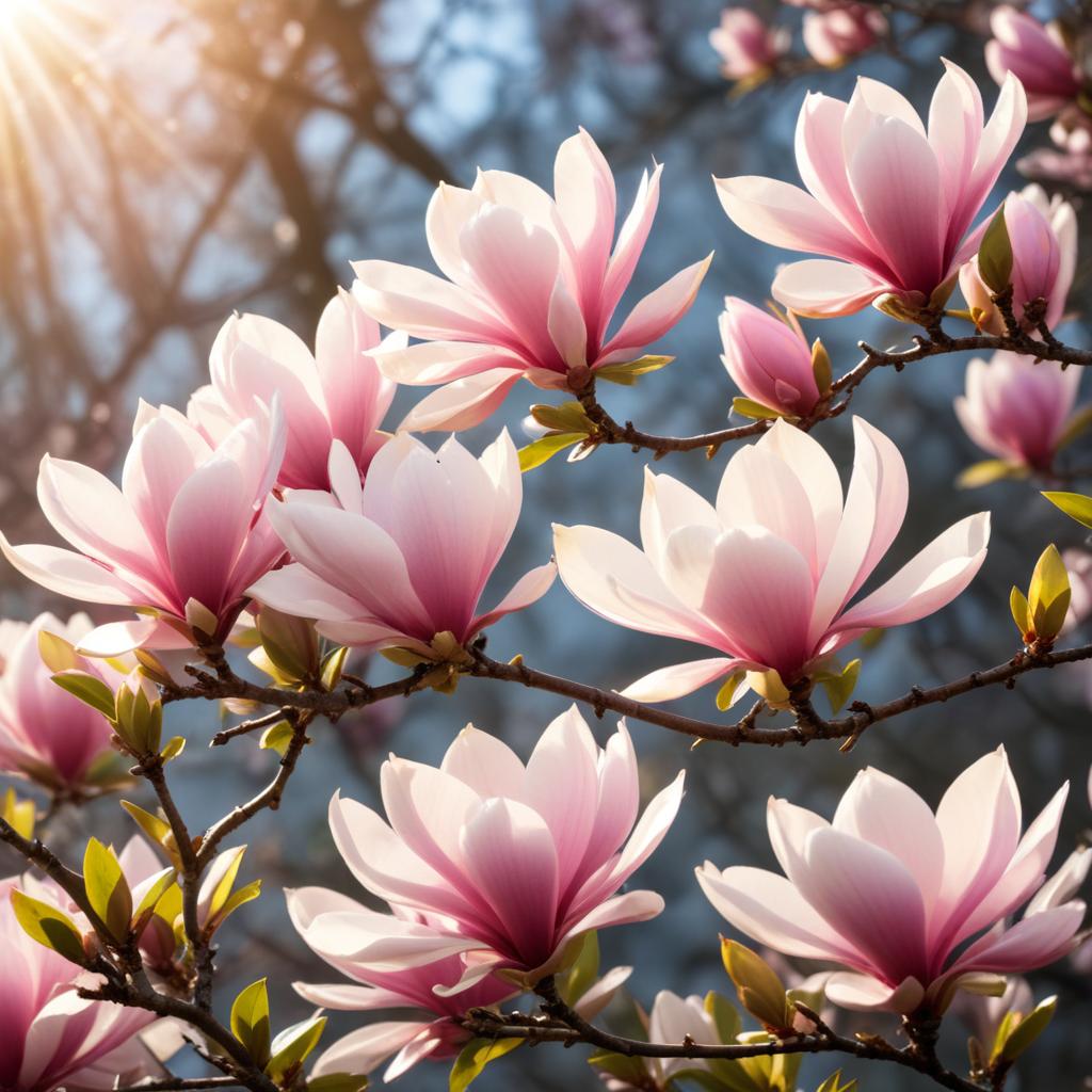 Delicate pink magnolia flowers bloom on branches, illuminated by bright sunlight against a clear blue sky in springtime.