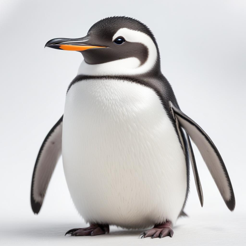 A penguin stands upright with a smooth white belly and black feathers. Its distinctive orange beak adds color to its appearance.