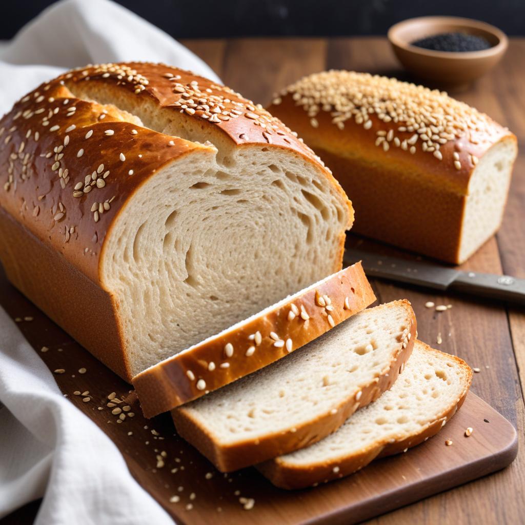 Sliced sesame bread loaves rest on a wooden cutting board. Soft, fluffy texture is visible, perfect for various meals.