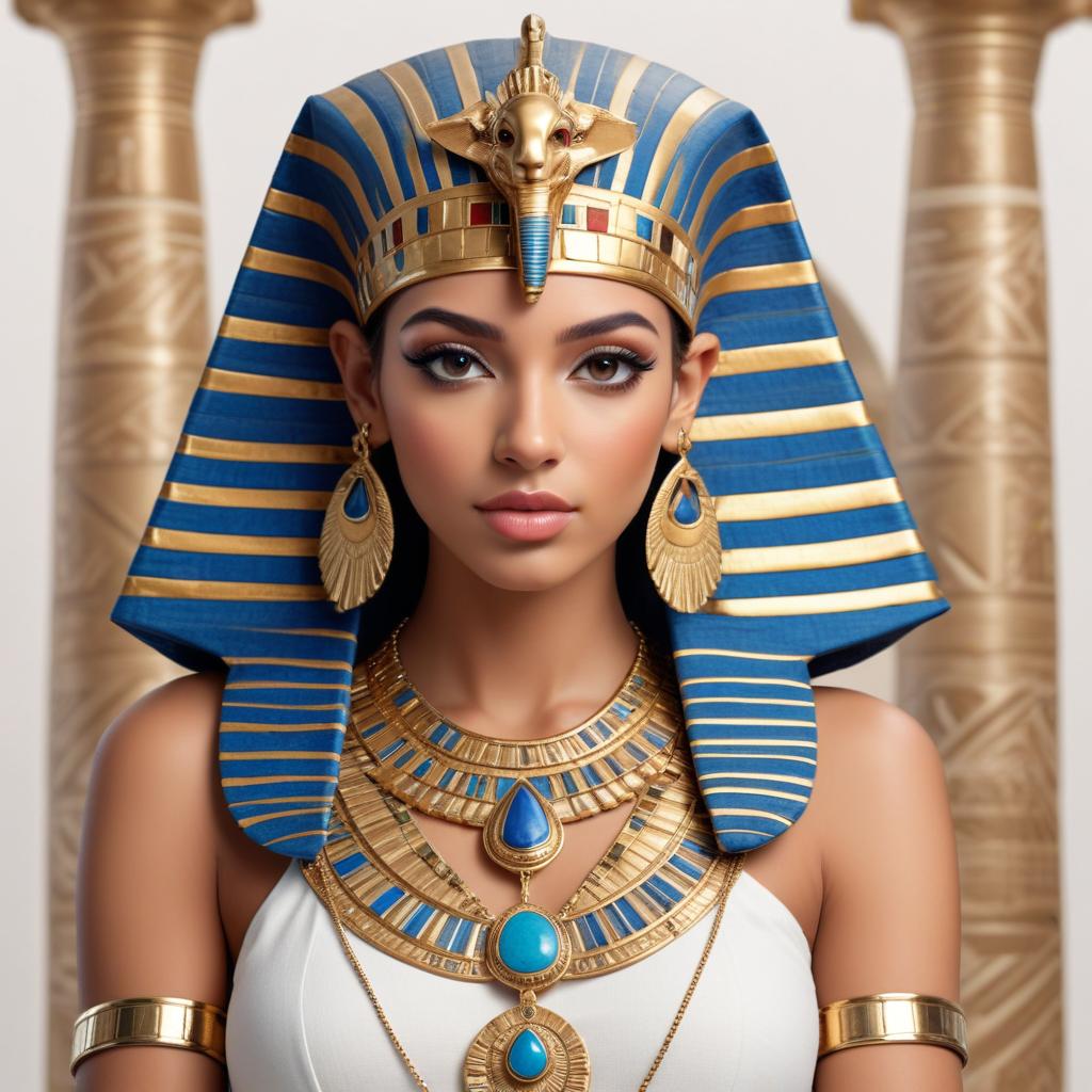 ancient civilization, ancient egypt, beauty, blue attire, columns, cultural representation, egyptian culture, elegance, fashion, gold jewelry, headdress, historical figure, majestic, pharaoh, portrait, queen, regal clothing, rich colors, royalty, traditional dress