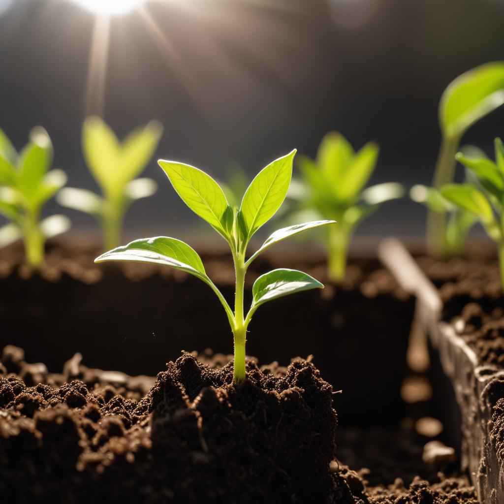 Bright green seedlings emerge from dark soil in a sunlit garden, marking the beginning of new growth and life in the spring season.
