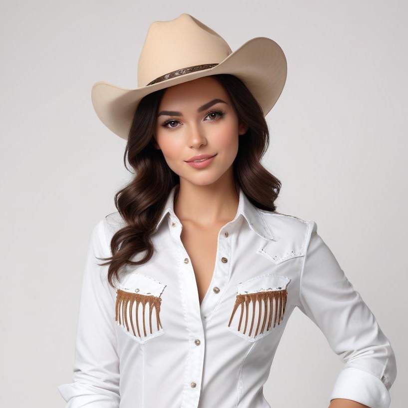 Americana, beauty, casual wear, confident pose, country fashion, cowboy hat, fashion, feminine style, fringe details, model, natural light, neutral background, portrait, ranch style, smiling, stylish shirt, trendy, western attire, woman, young adult