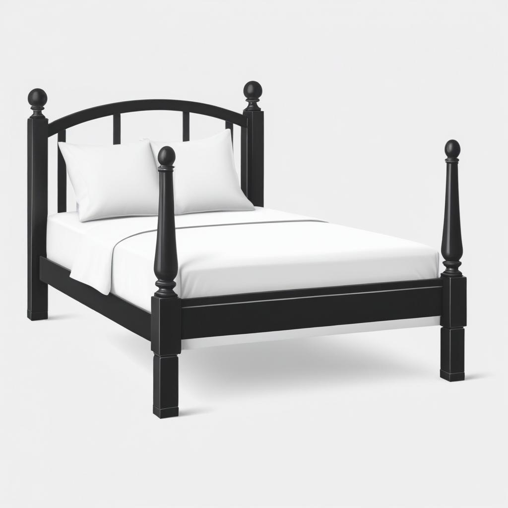 A stylish black wooden bedframe supports a white mattress and pillows, creating a modern and clean bedroom aesthetic.