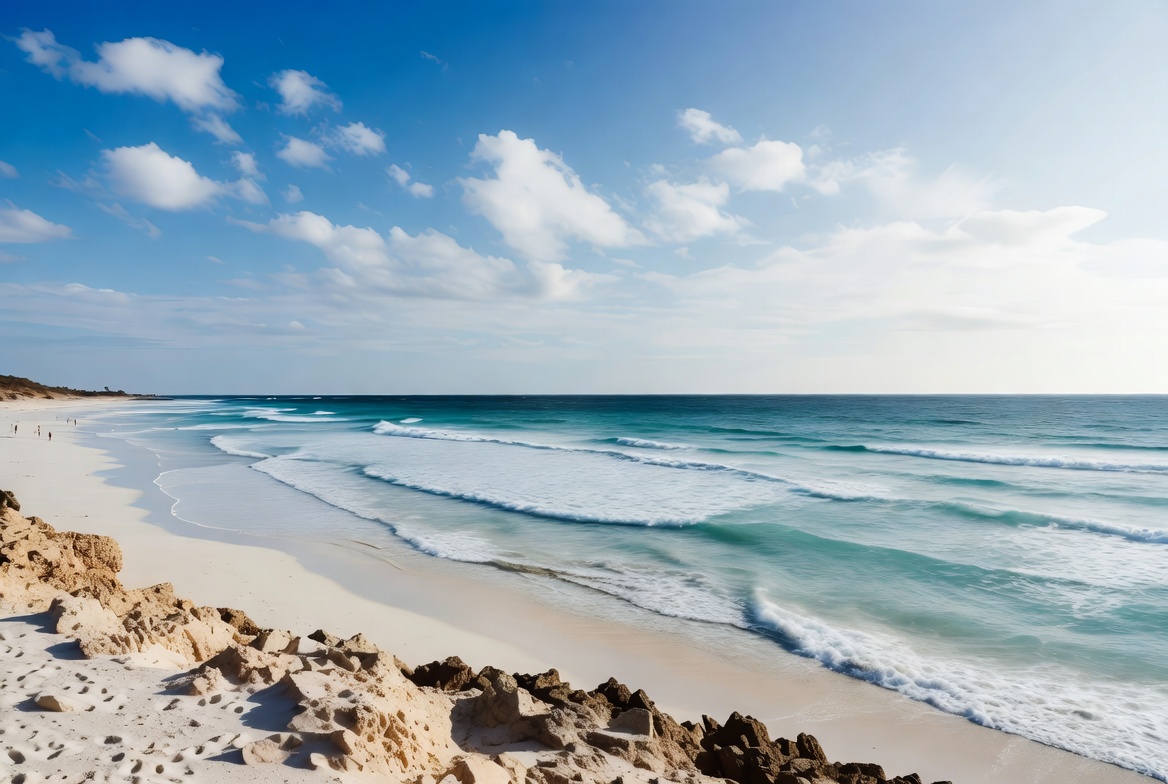 Waves gently roll onto a sandy shore under a bright blue sky. People stroll along the beach enjoying the warm sunshine and clear waters.
