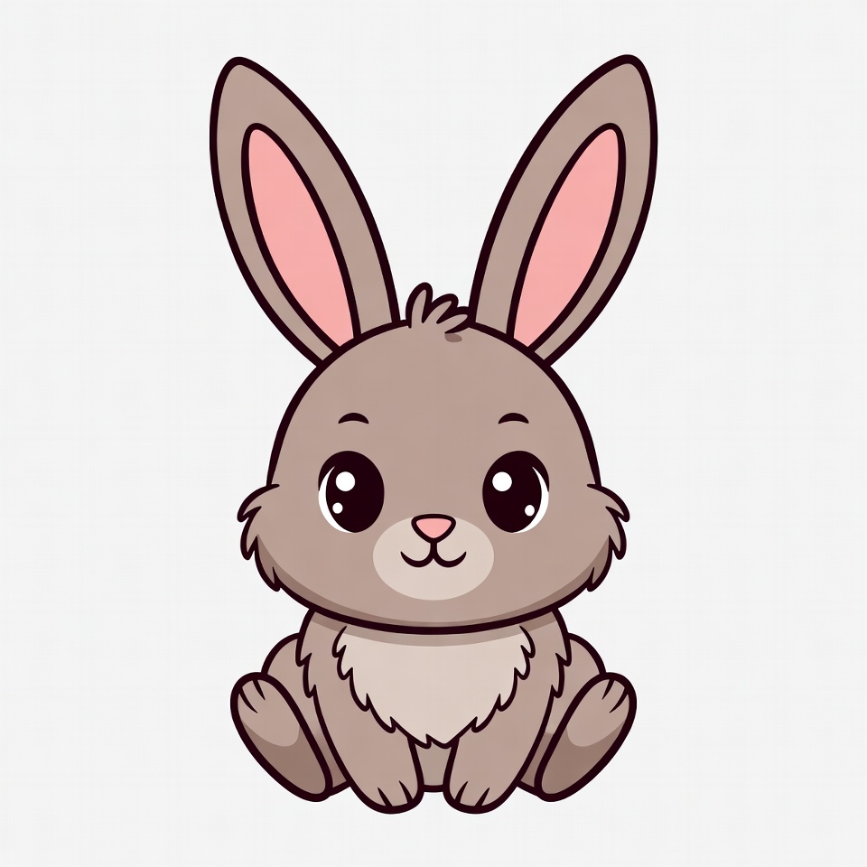 A brown cartoon rabbit with large ears and bright eyes sits peacefully. It has a fluffy belly and a cheerful expression, making it quite adorable.
