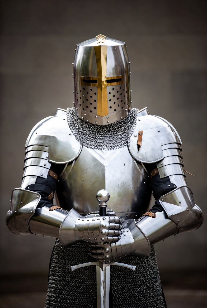 armor, battle, chainmail, character, confidence, helmet, heritage, historical, knight, medieval, metal, organization, pose, protection, standing, steel, strength, sword, warrior, weapon