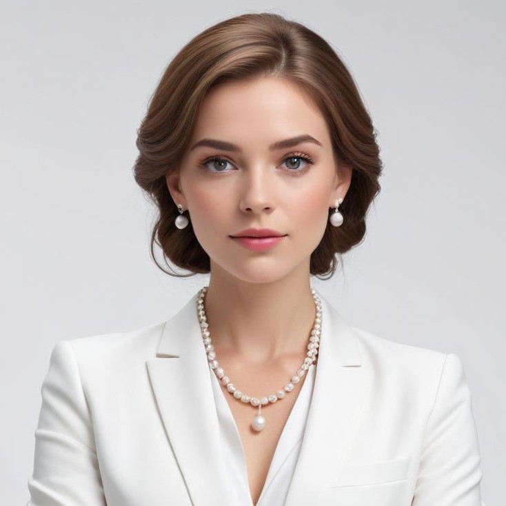 A young woman wears a stylish white suit with pearl jewelry. She faces the camera with a confident expression, showcasing her refined look.