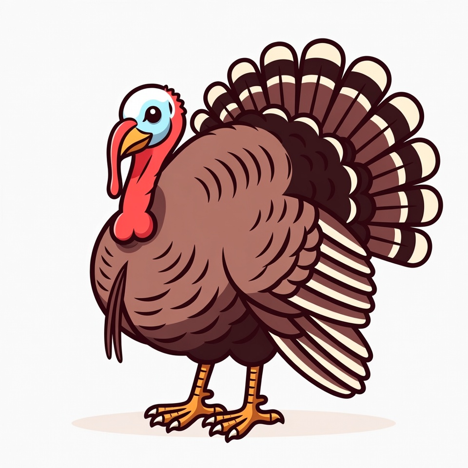 A cheerful cartoon turkey stands proudly with detailed feathers. The vibrant colors and fun design make it a delightful representation of this bird.