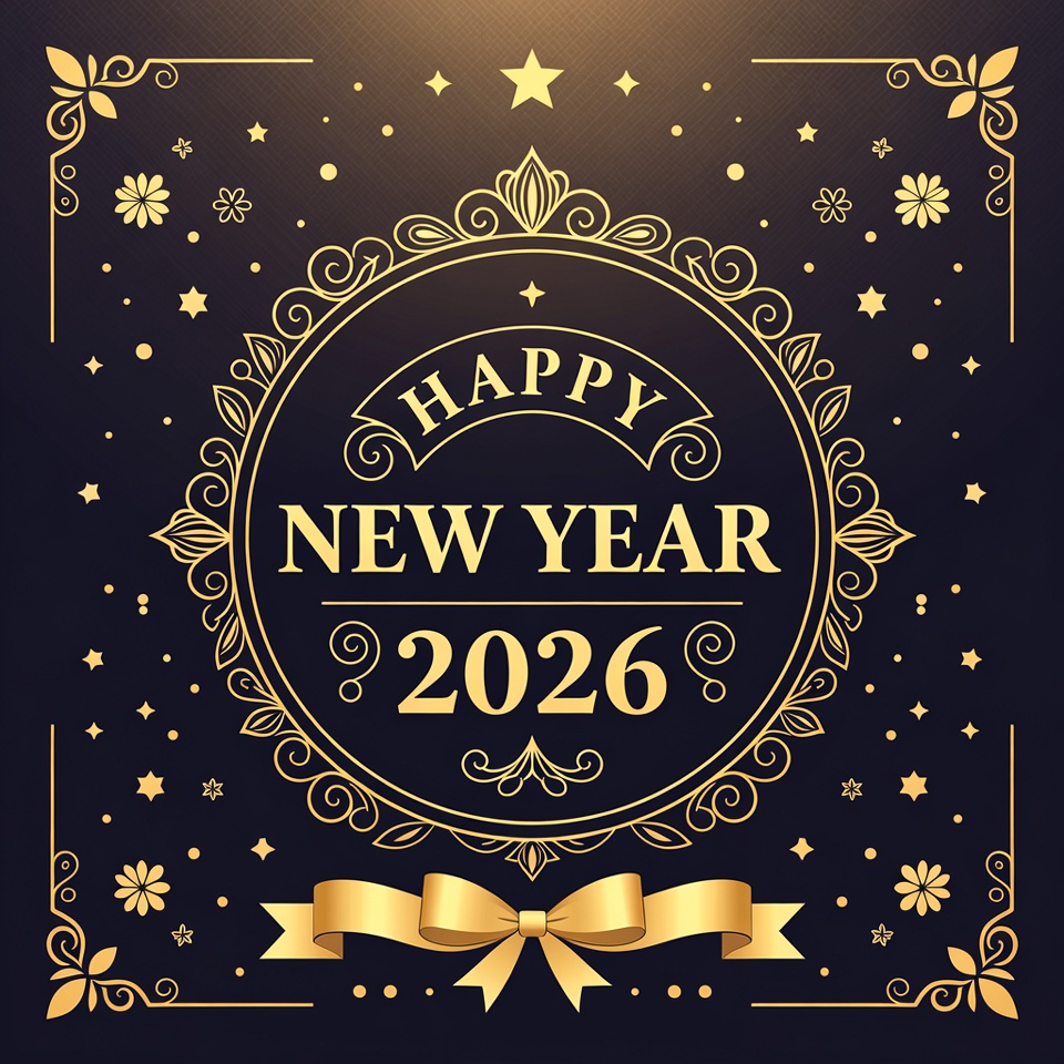 2026, artwork, background, bow, celebration, decoration, decorative, design, festive, flowers, gold, graphics, greeting card, holiday, new year, party, stars, text, typography, wishes
