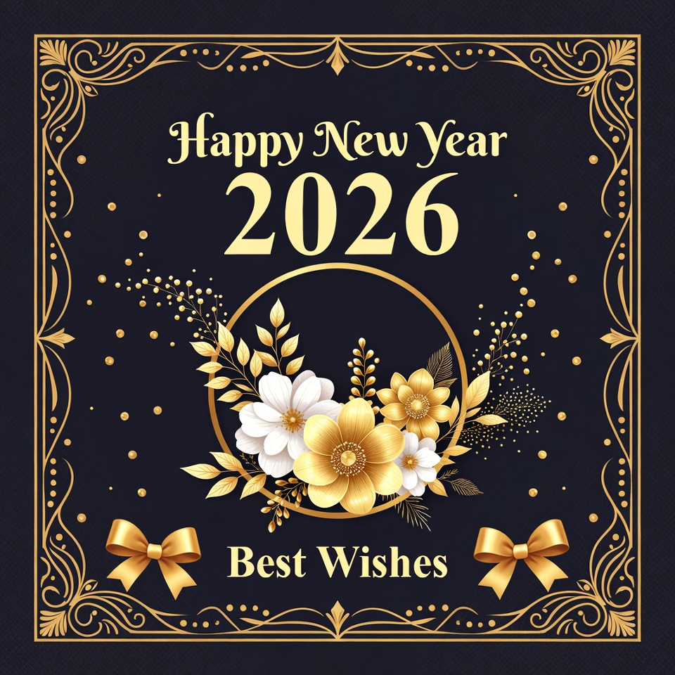 A festive design featuring elegant floral arrangements, golden text, and decorative bows, welcoming the year 2026 with best wishes.