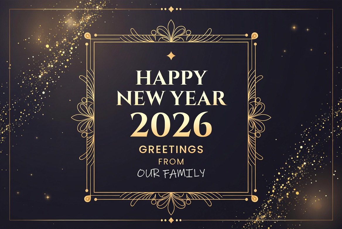 Beautiful New Year card wishing everyone joy in 2026, decorated with elegant designs and a dark background.