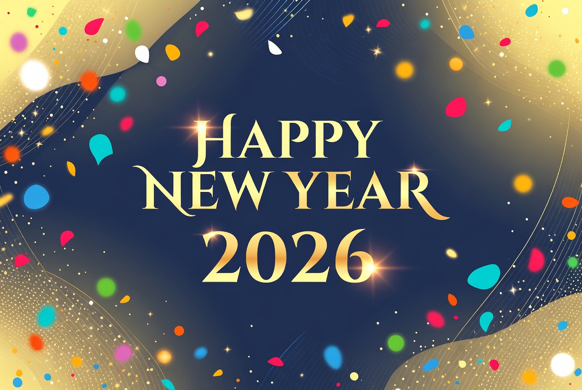 Colorful confetti surrounds the bold text wishing everyone a Happy New Year 2026, creating a festive and joyful atmosphere for celebrations.