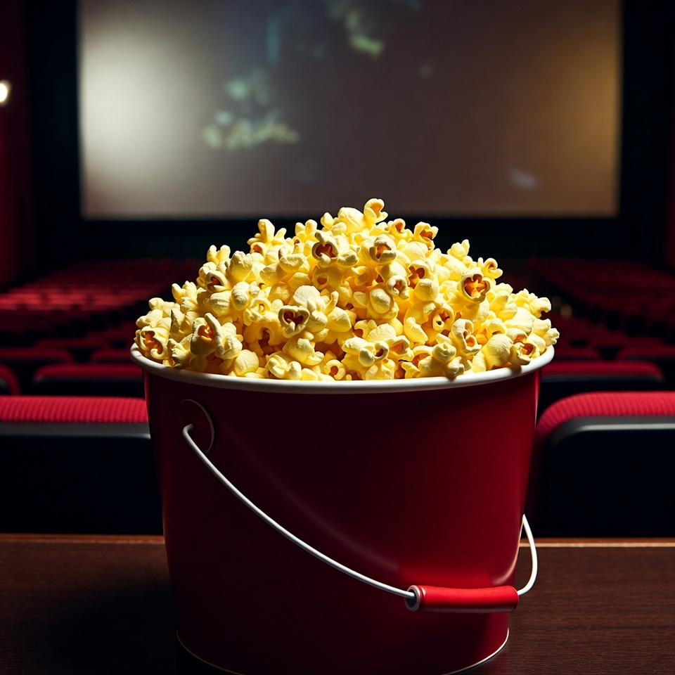 A large red bucket filled with buttery popcorn sits on a table in an empty movie theater with rows of seats and a dark screen.