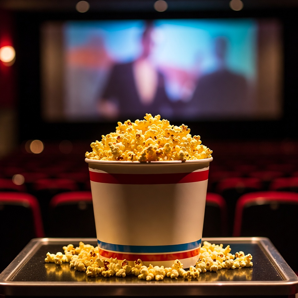 A large bucket of popcorn sits on a table at a cinema, with a movie playing in the background, inviting viewers to enjoy the show.