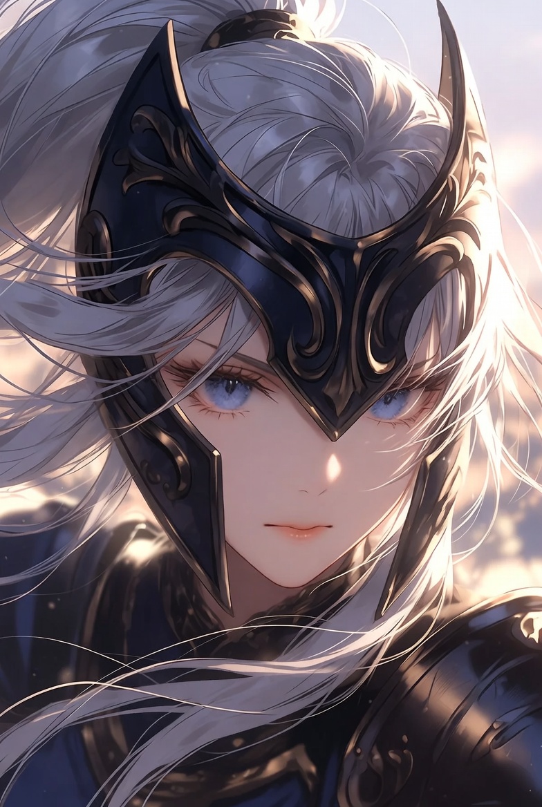 A fierce warrior with striking blue eyes stands confidently in shining armor against a backdrop of clouds during sunset.