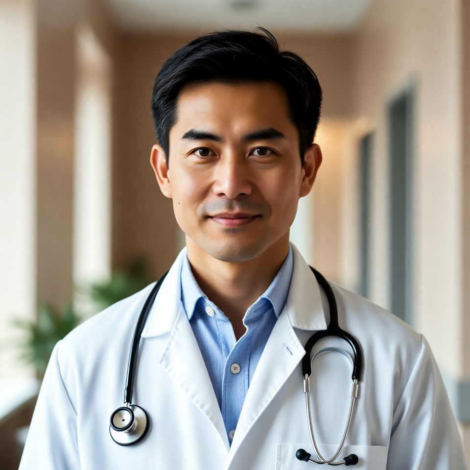 Asian doctor, clinic, confident, doctor, facility, health, healthcare, hospital, indoors, lab coat, medical, modern environment, patient care, professional, service, smiling, stethoscope, therapy, treatment, wellness