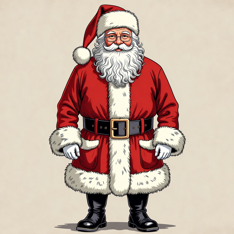 Santa stands proudly in a bright red coat with white fur trim. His cheerful face and glasses invite joy during the festive season.