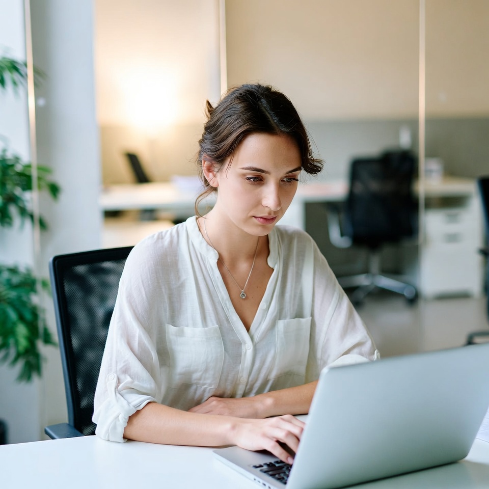 A woman in a white blouse is focused on her laptop in a modern office space with bright lighting and plants nearby.