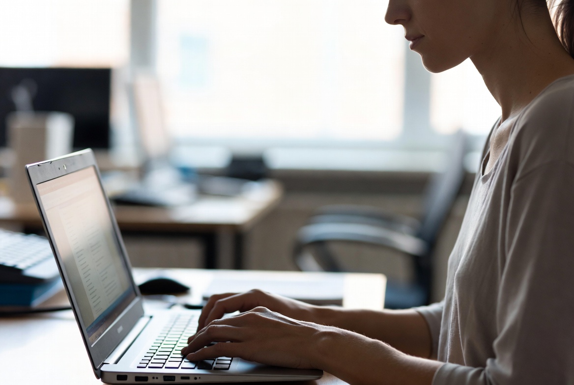 A woman focuses on typing on a laptop in a bright office space, surrounded by modern office equipment and natural light.