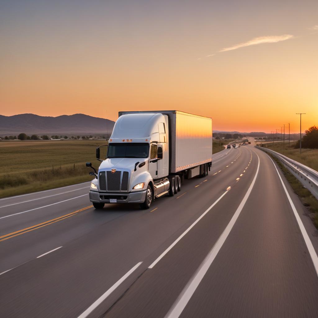A large white truck drives along a winding highway as the sun sets over distant mountains, casting a warm glow in the evening sky.