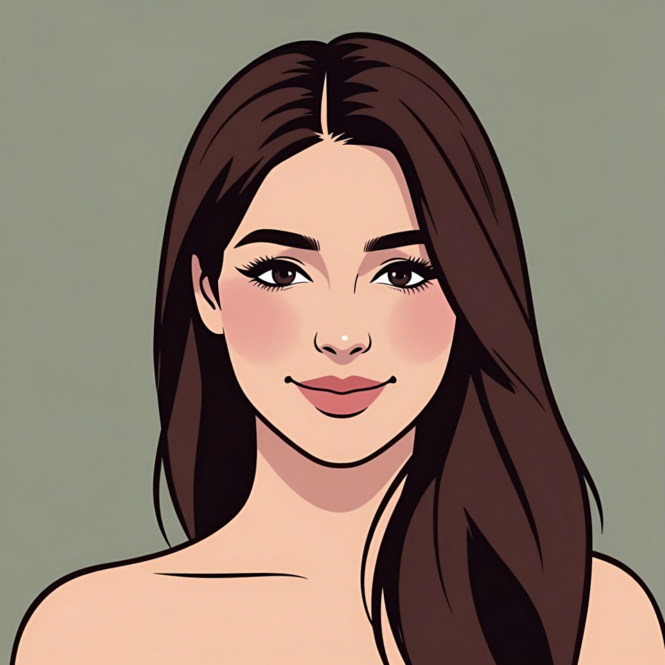A woman with long, dark hair smiles softly against a muted green background. Her makeup is natural, highlighting her features.