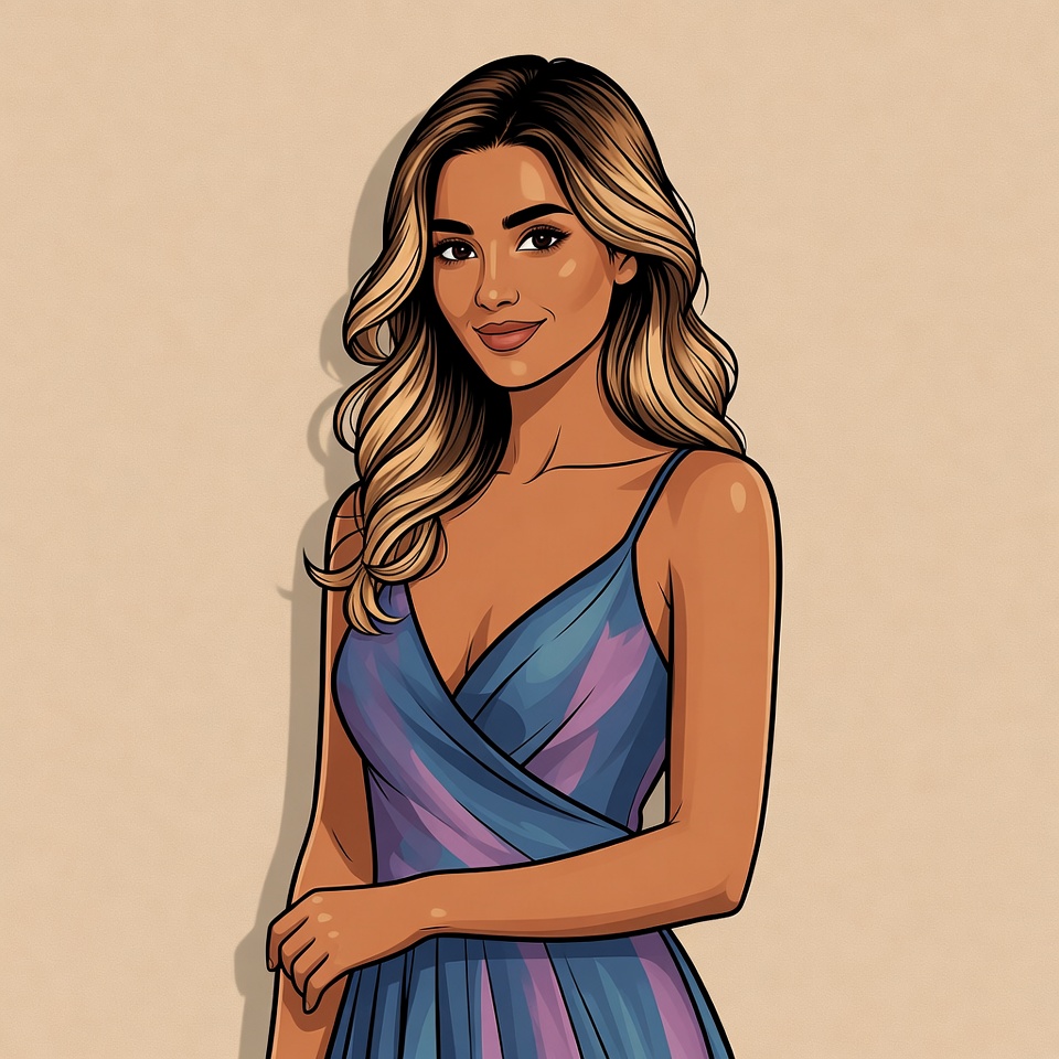A young woman poses confidently in a casual blue and purple dress, smiling with her long hair elegantly styled.