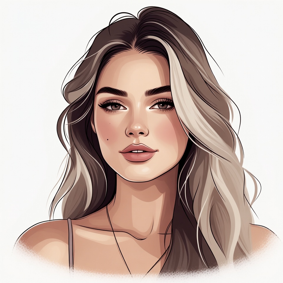 A woman poses with long, flowing hair, showcasing a natural and fresh look. Her expression is calm and inviting, embodying beauty.