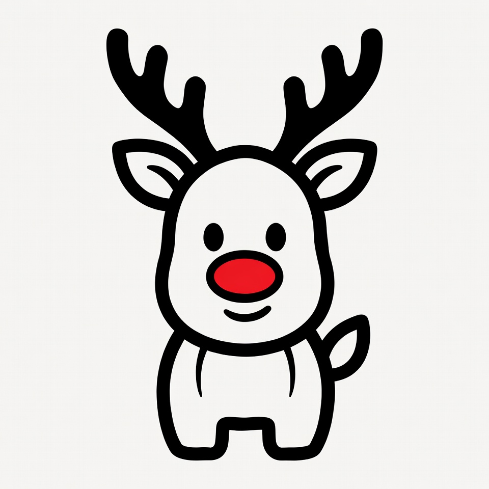 A simple cartoon reindeer stands with a friendly smile and bright red nose. Its antlers are large, adding to its adorable look.