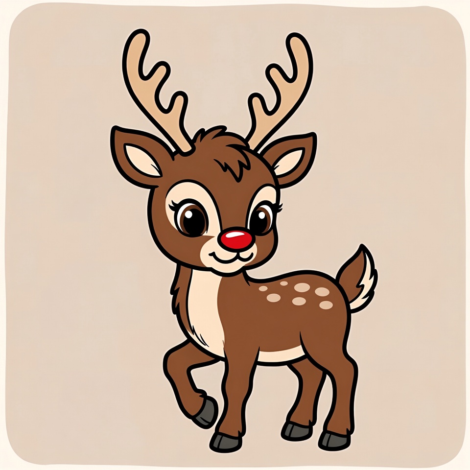 animal, antlers, art, big eyes, brown fur, cartoon, character, charming, cute, deer, festive, friendly, illustration, nature, playful, red nose, reindeer, whimsical, wildlife, young