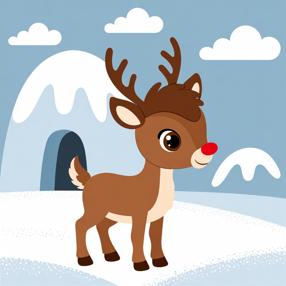 A cheerful reindeer stands in a snowy area with hills and clouds, showcasing its bright red nose and playful expression.