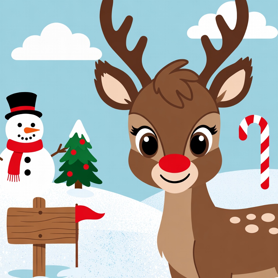 A playful reindeer stands in a snowy landscape beside a snowman and Christmas tree, creating a joyful winter holiday atmosphere.