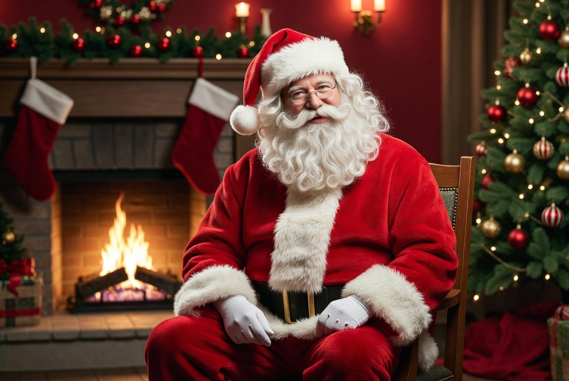 Cheerful Santa Claus sits near a cozy fireplace, surrounded by Christmas decorations and stockings, spreading holiday cheer and joy.