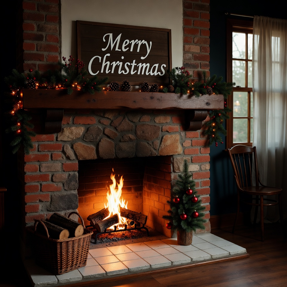 A warm fireplace glows with a crackling fire, surrounded by festive decorations, creating a cozy atmosphere for Christmas celebrations.