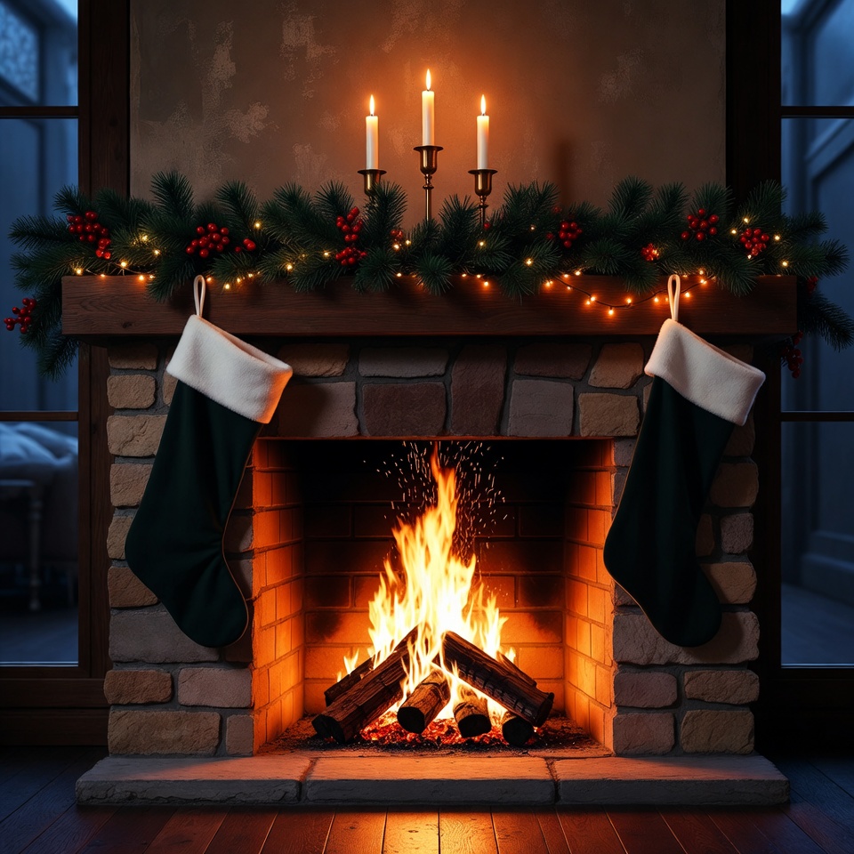 Cozy fireplace with a roaring fire and decorated mantel. Green stockings hang, creating a festive atmosphere for the holiday season.
