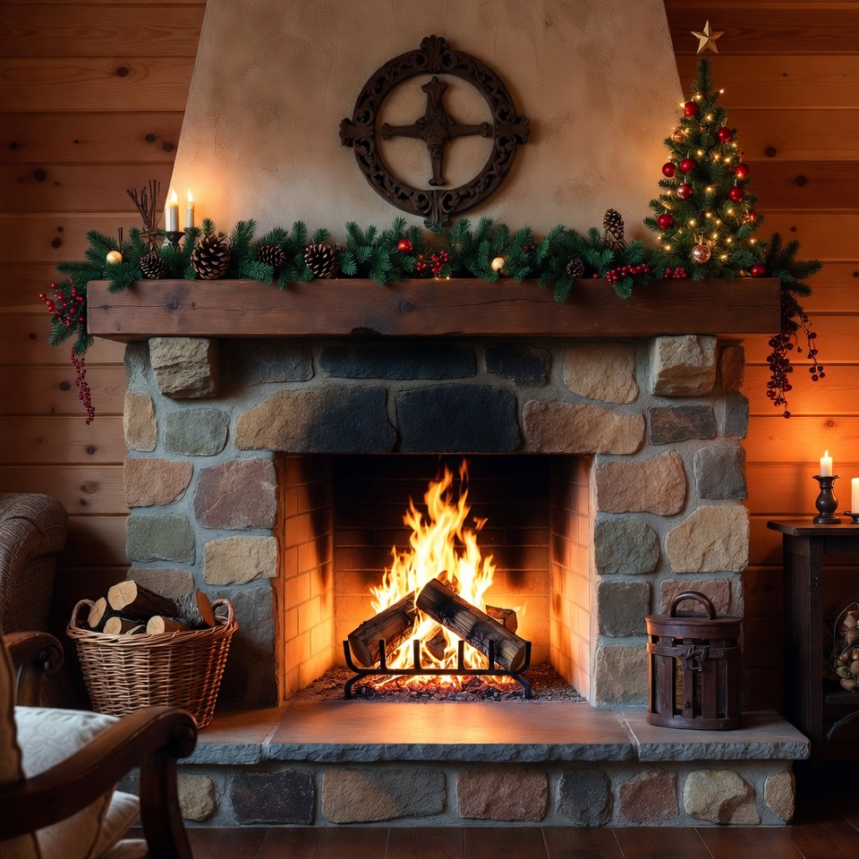 Warm flames dance in a stone fireplace, surrounded by festive greenery and a small Christmas tree, creating a welcoming holiday atmosphere.
