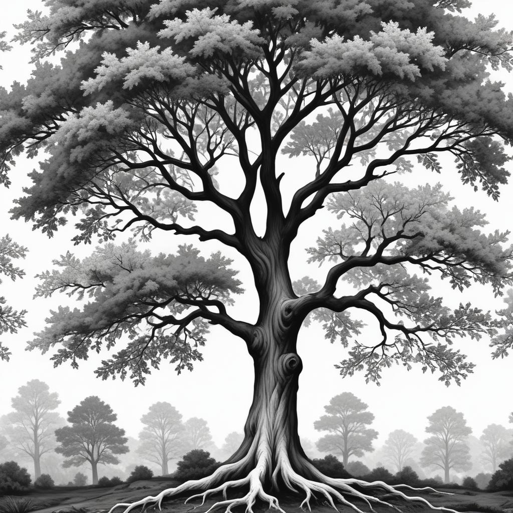 branches, canopy, design, environment, foliage, forest, growth, illustration, landscape, leafless, life, monochrome, nature, outdoors, park, roots, serenity, tranquility, tree, trunk