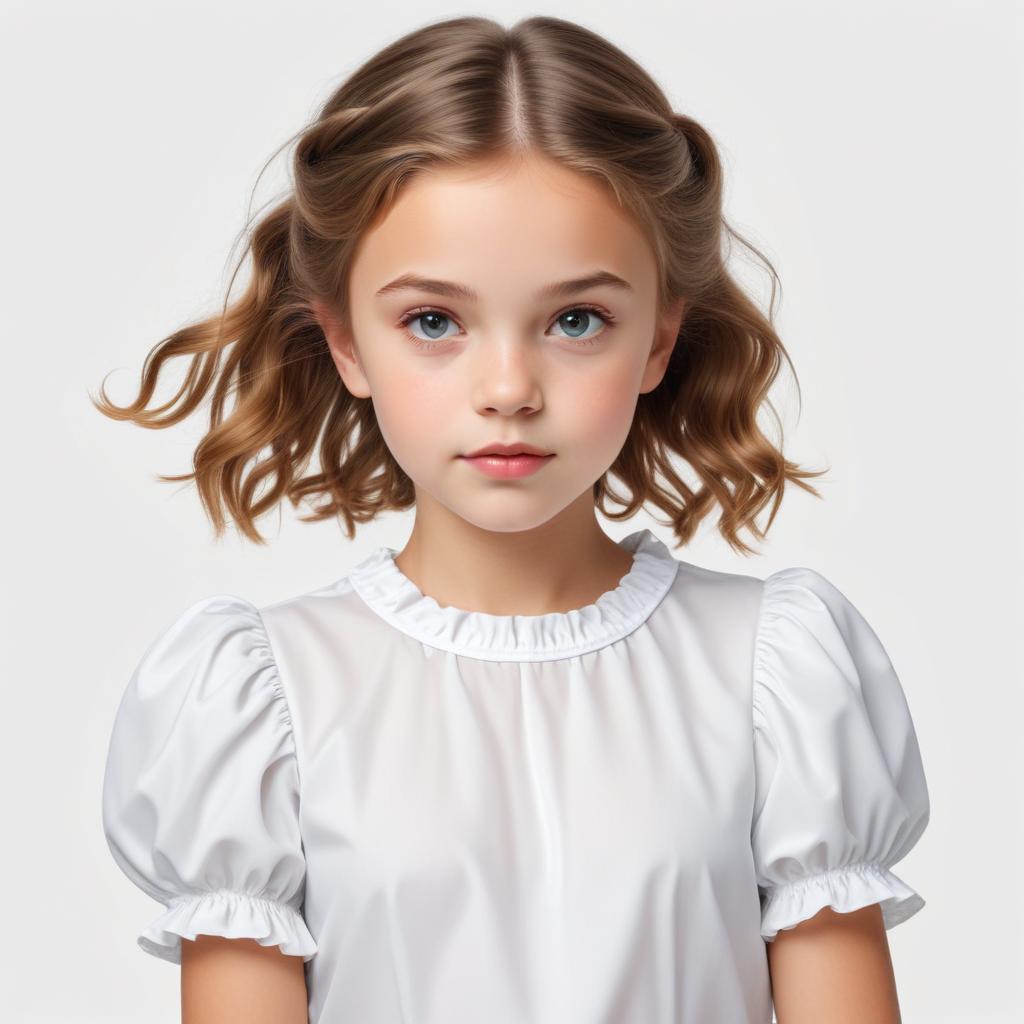 A young girl in a white puff-sleeve dress stands against a neutral background, gazing calmly at the viewer.