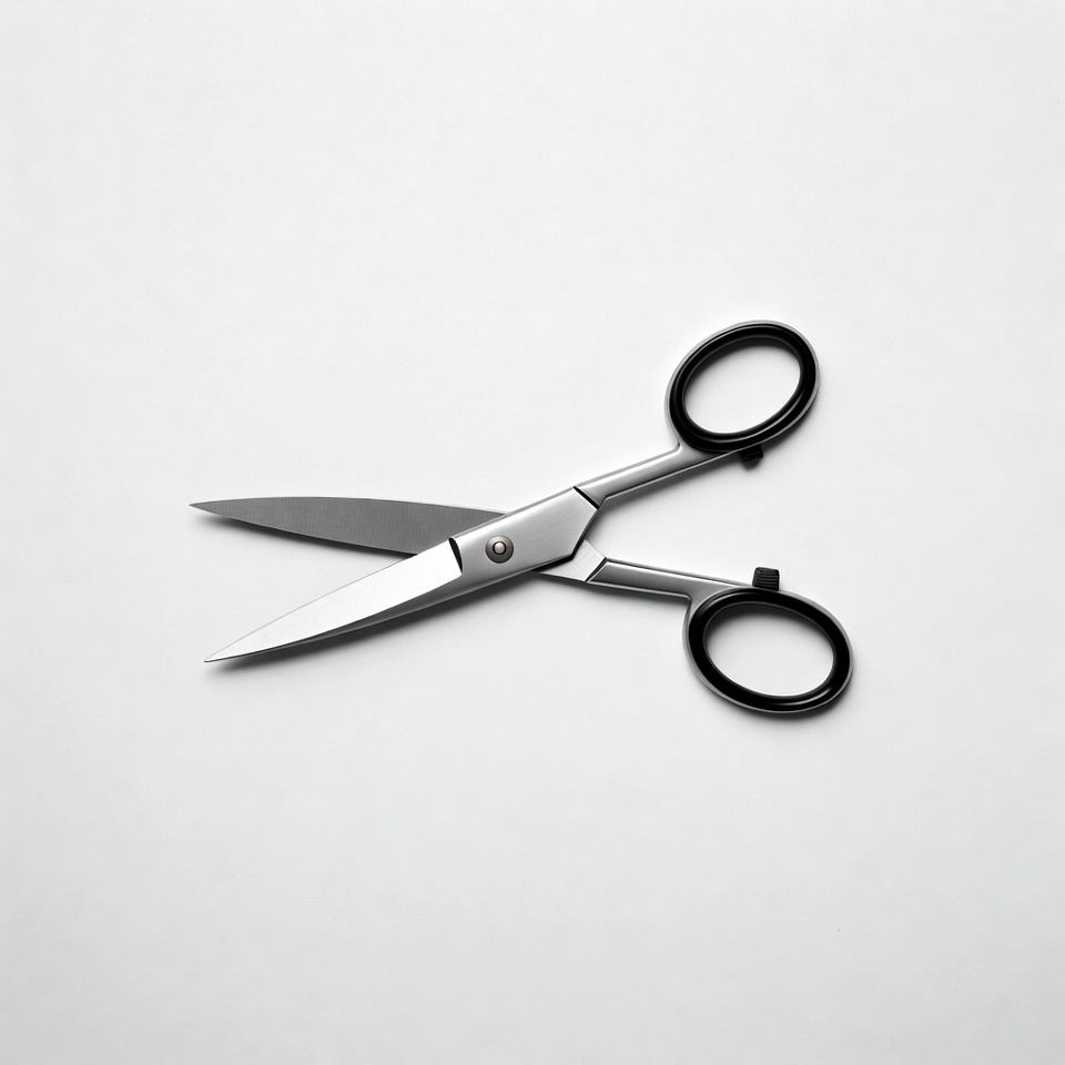 Scissors with a shiny blade and black handles rest on a plain white surface, ready for cutting tasks.