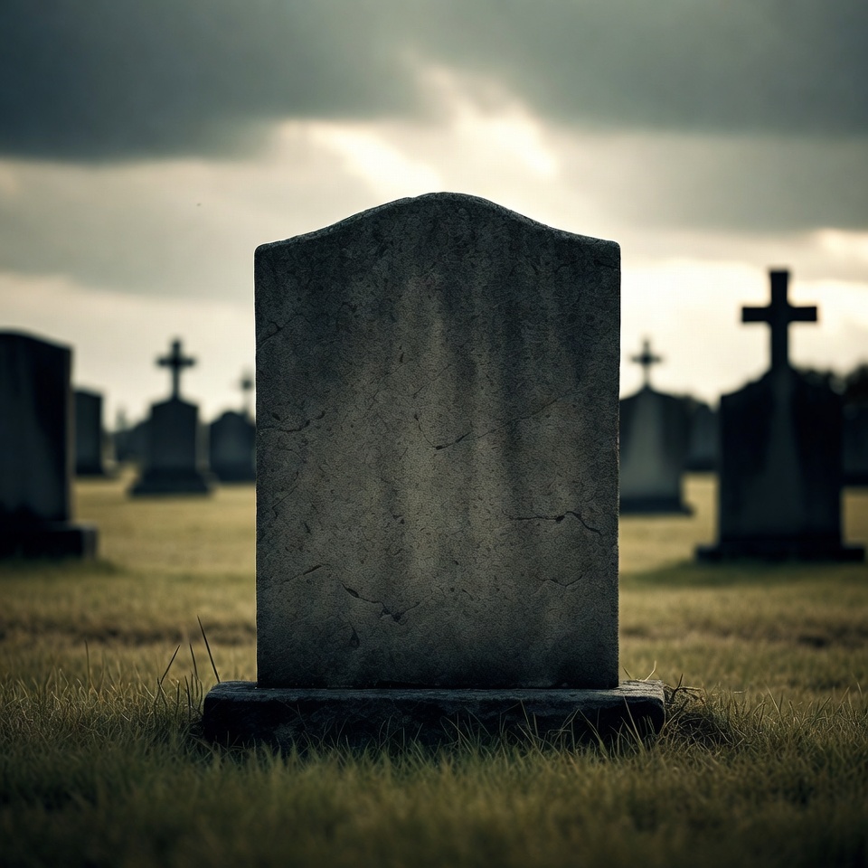 A weathered gravestone stands alone in a serene cemetery. Clouds loom overhead, casting a somber atmosphere over the scene.