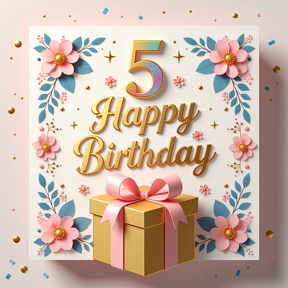 Bright birthday card features a gold number 5, flowers, and a gift box, celebrating a child's fifth birthday with joyful decorations.