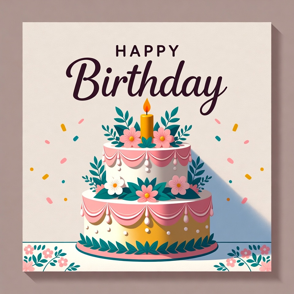 A colorful birthday cake is decorated with flowers and a candle. Celebratory confetti adds to the joyful atmosphere.