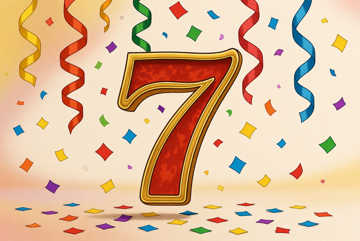 Bright number seven stands out against a festive background filled with colorful confetti and streamers, perfect for a birthday celebration.
