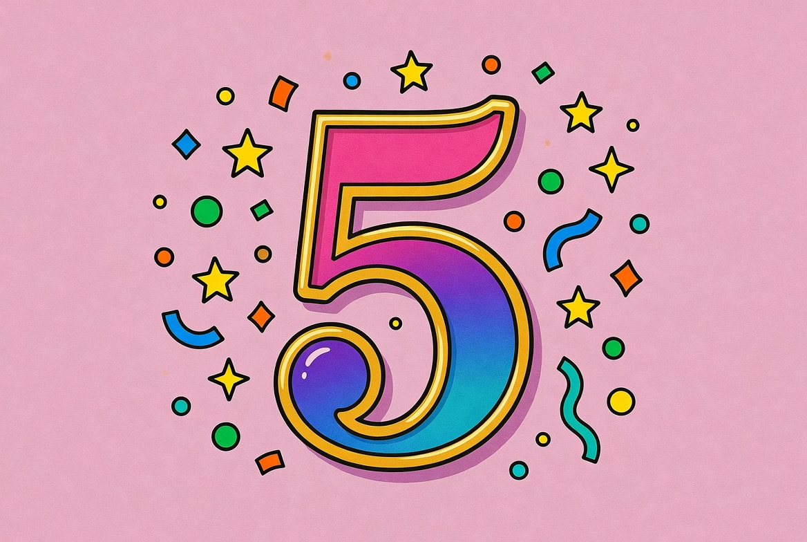 A vibrant number five in bold colors is surrounded by confetti, stars, and swirls. The cheerful design suggests celebration and joy.