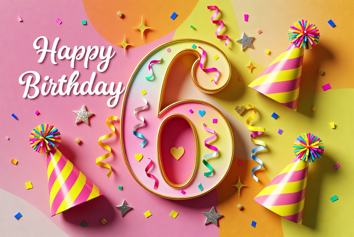 Bright decorations celebrate a child's sixth birthday, featuring a large number, party hats, and colorful confetti scattered around.
