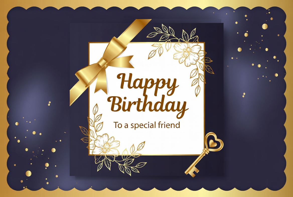 Gold and dark blue birthday card design with flowers, a bow, and a key. Perfect for celebrating a special friend's birthday.