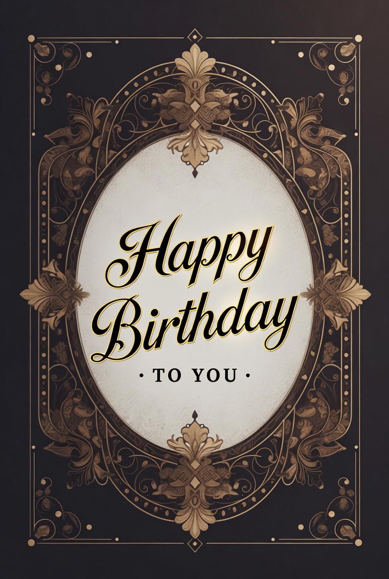 A beautiful birthday card features ornate elements with a classic design. The greeting Happy Birthday to You is elegantly displayed.