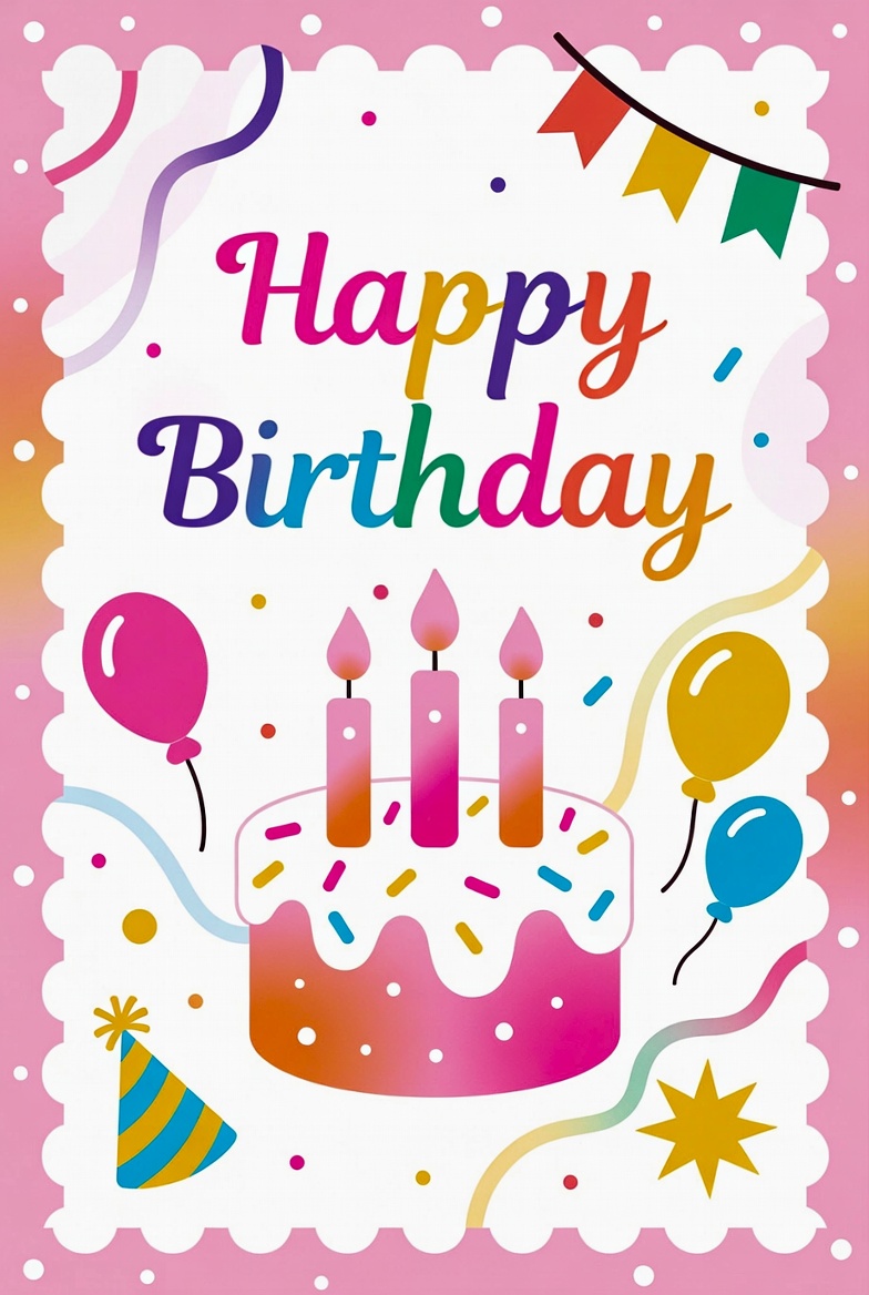 A festive birthday card features a cake with candles, balloons, and confetti in vibrant colors, perfect for celebrating special moments.