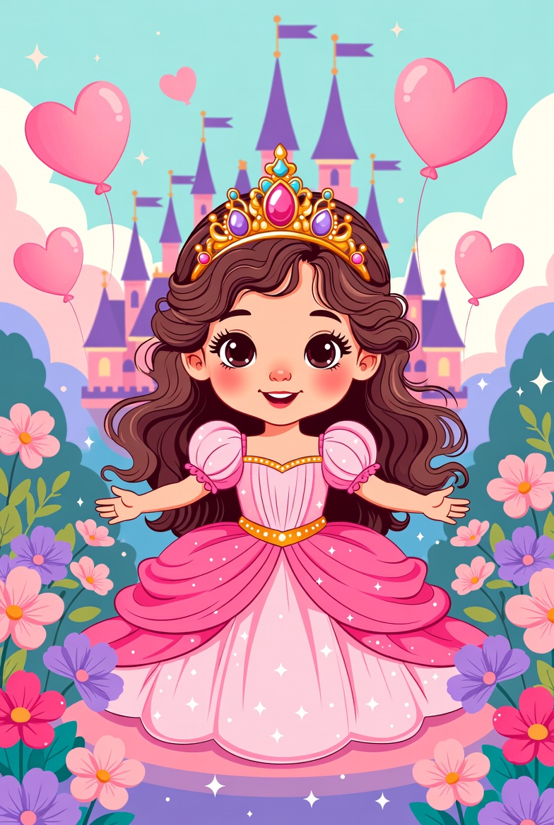 A cheerful young princess in a pink dress stands in a colorful garden filled with flowers. Balloons float around her, with a castle in the background.