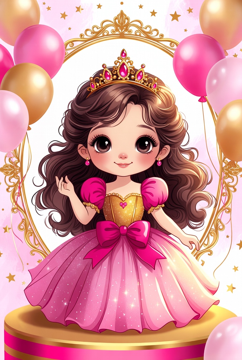 A charming young girl dressed as a princess smiles cheerfully while surrounded by pink balloons and golden decor at a festive celebration.