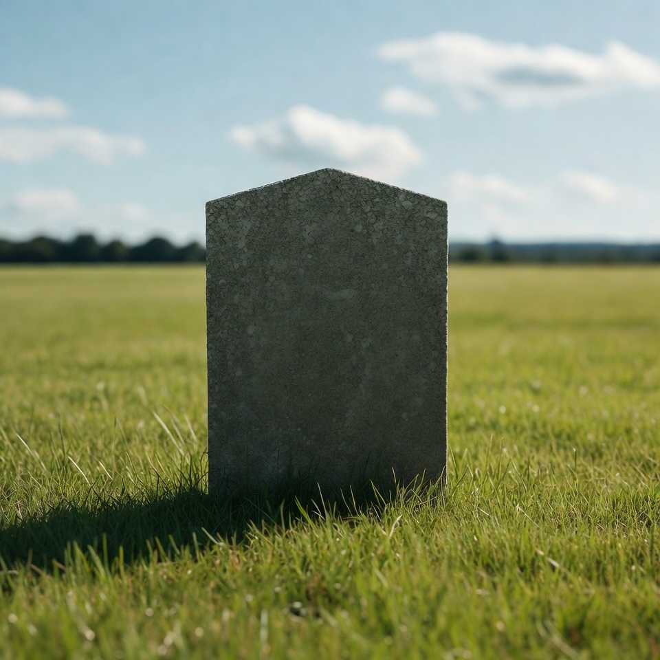 A stone marker stands alone in a grassy field under a clear blue sky, surrounded by distant trees and hills, evoking a peaceful ambiance.